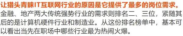 IT互联网已离不开猎头:IT互联网行业催生了最多百万佣金猎头顾问,包括IT互联网、计算机硬件在内的诸多新锐行业,在人才招聘上对猎头的依赖程度正变得越来越高。