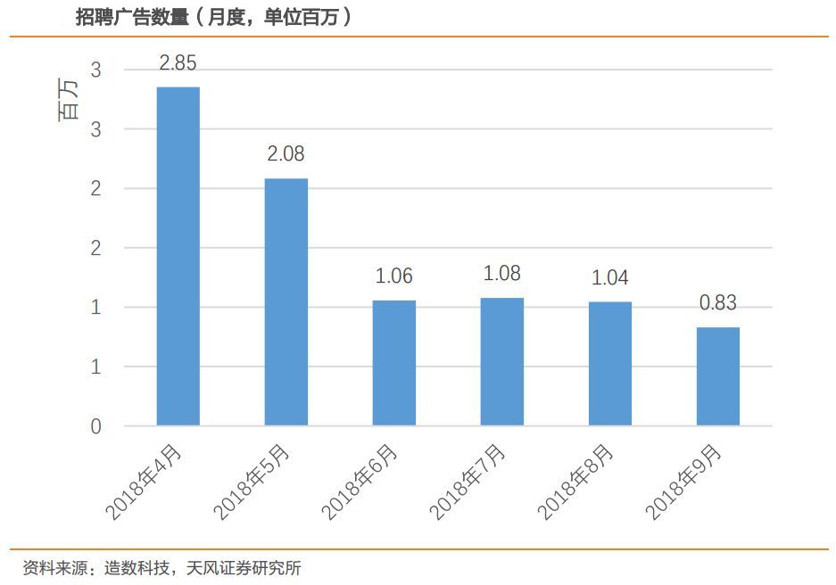 今年4至9月,天风证券在前程无忧上共爬取了894万个招聘广告,其中,4月抓取到了285万个,5月下降到208万个,6到8月进一步下降到100多万个,9月则仅剩83万个。也就是说,9月相比于4月,招聘广告减少了多达202万个。
