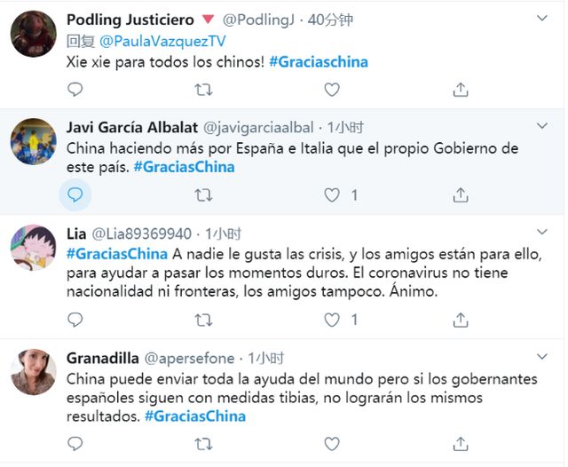 继许多意大利网友在中国使馆的社交媒体主页下点赞感谢中国物资援助后,西班牙网友也开始在推特上发起“感谢中国”(GraciasChina)的热词标签,这是因为西班牙多家媒体报道,一批来自中国的口罩与核酸检测盒正在前往西班牙的路上。